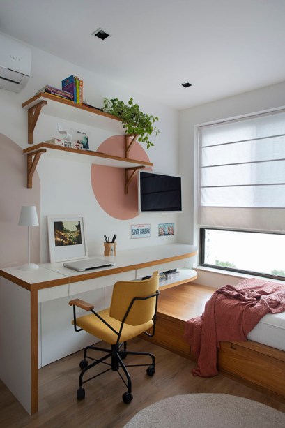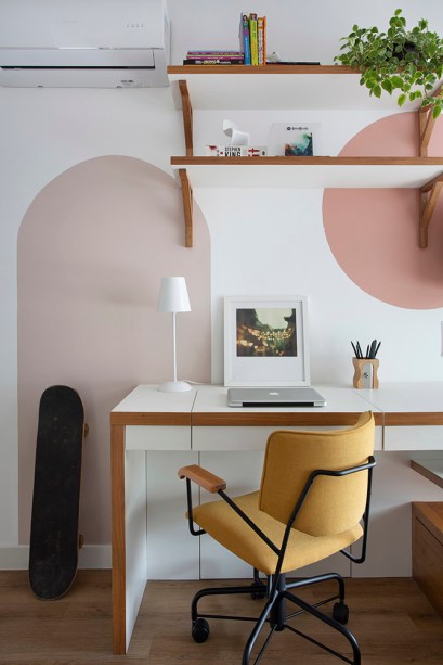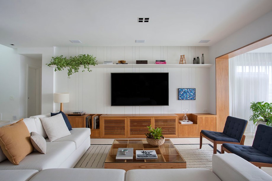 “Eles queriam um espaço de lazer superconfortável e agradável para receber parentes e amigos. Além disso, precisavam de uma área de estudos ou home office em todos os quartos. Devido à pandemia, as filhas passaram a estudar em casa e o casal a trabalhar remotamente na maior parte do tempo”, explica a arquiteta Ana Luisa Cairo.
