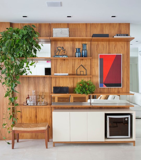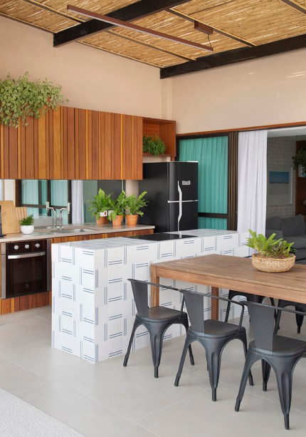 Outro destaque do projeto é a marcenaria da sala principal, desenhada pelos arquitetos, em especial a estante em freijó com espelhos, compondo o canto do bar, e, do outro lado, o móvel-rack sob a TV, com espaço para armazenar discos de vinil. Já no andar superior, a dupla destaca os azulejos com estampa geométrica usados na ilha do cooktop da área gourmet e na parede do lavabo.