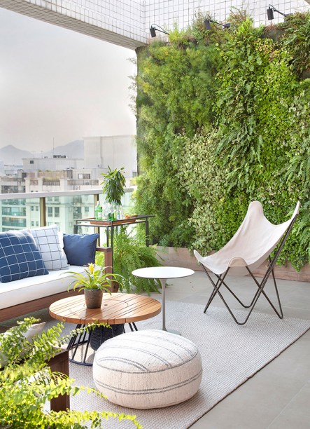 “Criamos três ambientes na área externa da cobertura. Uma área gourmet completa, com mesa, bancada e churrasqueira. Uma área de estar descoberta, que tem como pano de fundo o jardim vertical. E a área da piscina”, detalha Gustavo.