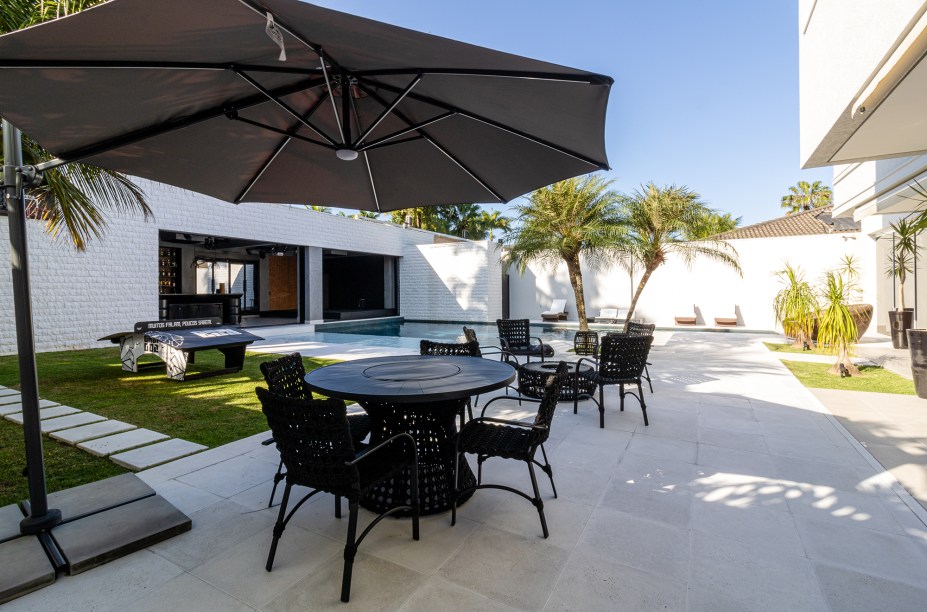 A residência, construída há 10 anos, passou por um retrofit na área de lazer. Com um perfil familiar que valoriza receber convidados, o desafio era integrar elementos contemporâneos à estrutura existente, preservando sua essência.