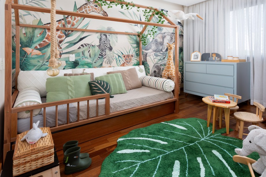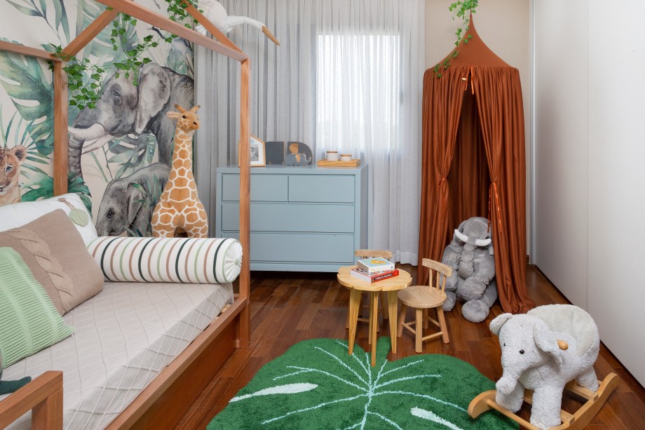 “A moradora também estava alucinada com o tema de floresta do quartinho do filho. Ela chegou com o tema na cabeça e pediu para desenvolver algo que fosse leve e gostoso, pois seria o cantinho do seu filhote e também pediu para estender esse tema para o banheiro”, contam os arquitetos.
