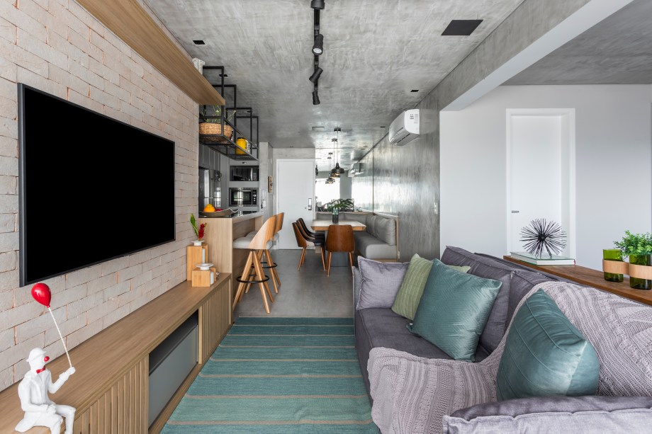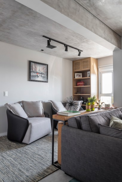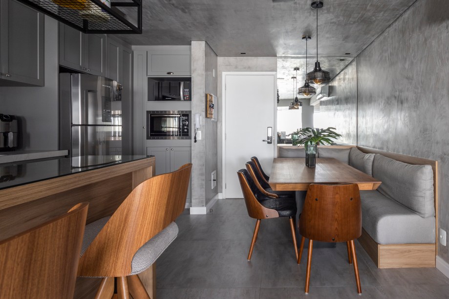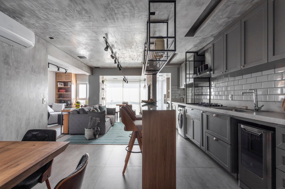 A cozinha, por sua vez, foi o primeiro pedido das duas: ela devia vir no estilo provençal. O resto do apê segue o estilo contemporâneo com toques do industrial e distribui o cinza, o cimento queimado e a serralheria pelo décor.