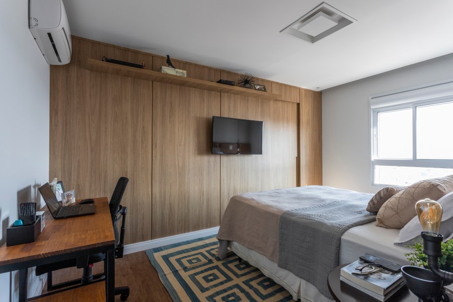 As moradoras também não tinham planos para filhos, por isso propôs-se integrar a suíte com o segundo dormitório, ganhando assim um espaçoso closet logo na saída do banheiro.