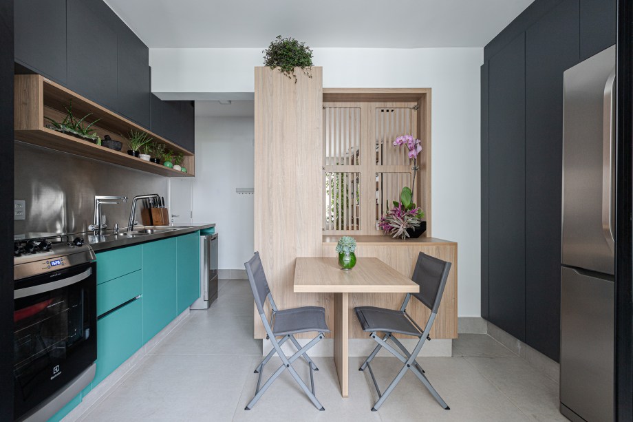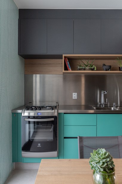 Cozinha mescla inox e marcenaria verde neste apartamento de 95 m²