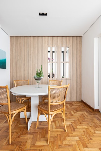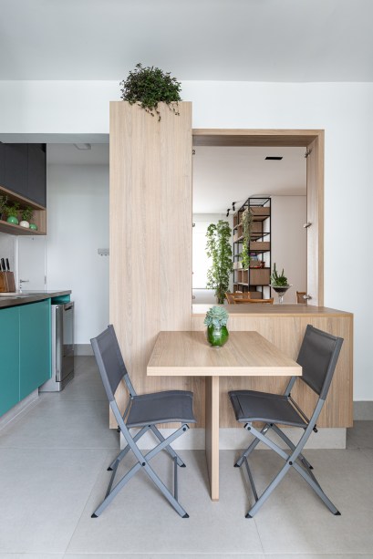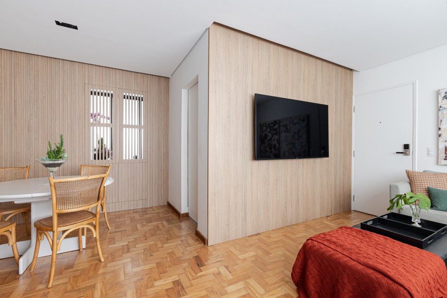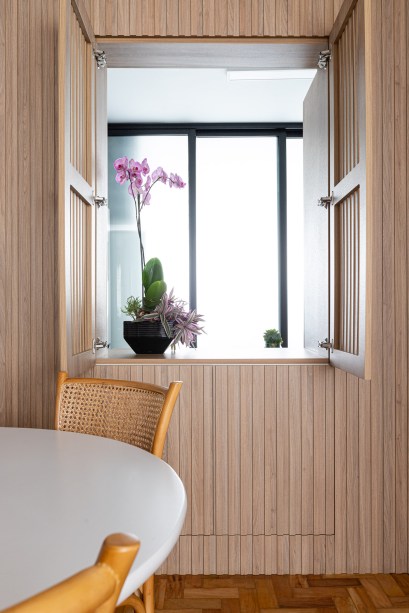“Demolimos também parte da parede que separava a sala da cozinha para integrar esses ambientes através de um passa prato. Essa ligação foi feita com um painel de marcenaria ripada. As ripas vazadas são como uma ‘janela’ para a cozinha e, quando fechadas, também permitem a passagem de luz”, dizem. Logo abaixo dessa abertura, um móvel esconde o bar.