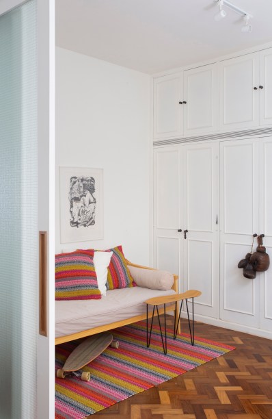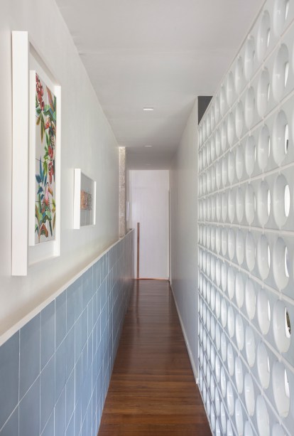 Já nas áreas sociais, a cozinha foi integrada com a sala através de painéis de correr em marcenaria e vidro. Na lateral dela, foi erguida uma divisória em cobogós vazados a fim de trazer mais luz natural para o hall íntimo, que é muito extenso (tem 9 metros).