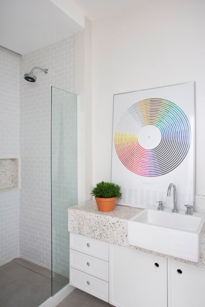 Porque o casal é fascinado pelo mundo da arte e do design, a curadoria dos objetos de decoração partiu da própria moradora. Inclusive, algumas obras de arte são assinadas por ela, entre cerâmicas artesanais, azulejos estampados, pinturas e até móveis customizados, como a mesinha com tampo de skate no quarto de hóspedes.
