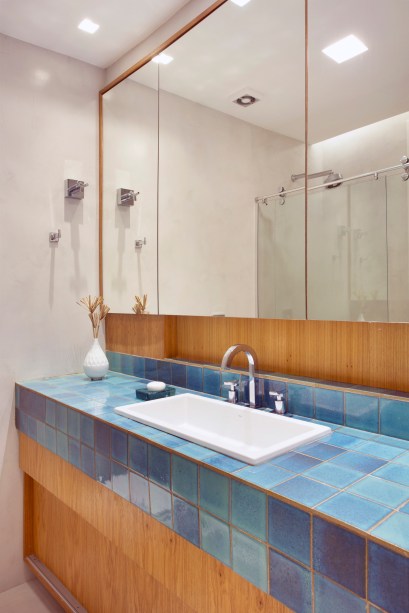 Os arquitetos, por sua vez, buscaram uma paleta clara e preservaram a madeira existente no piso, deixando as cores mais vibrantes para itens pontuais no décor. Como o Felipe é surfista e a Tati admiradora do mar, o azul foi escolhido como tom predominante para pontuar o projeto.