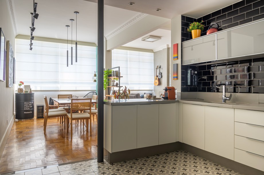 Antes da reforma, a cozinha era apertada e escura. Durante o processo de integração e derrubada das paredes, descobriu-se a tubulação de águas pluviais do prédio. Como ela não podia sofrer alterações, a solução foi deixá-la à mostra, pintada de preto. O piso recebeu um padrão estampado e as paredes o tijolinho preto.