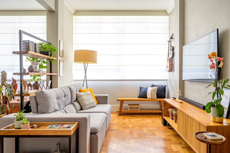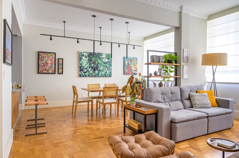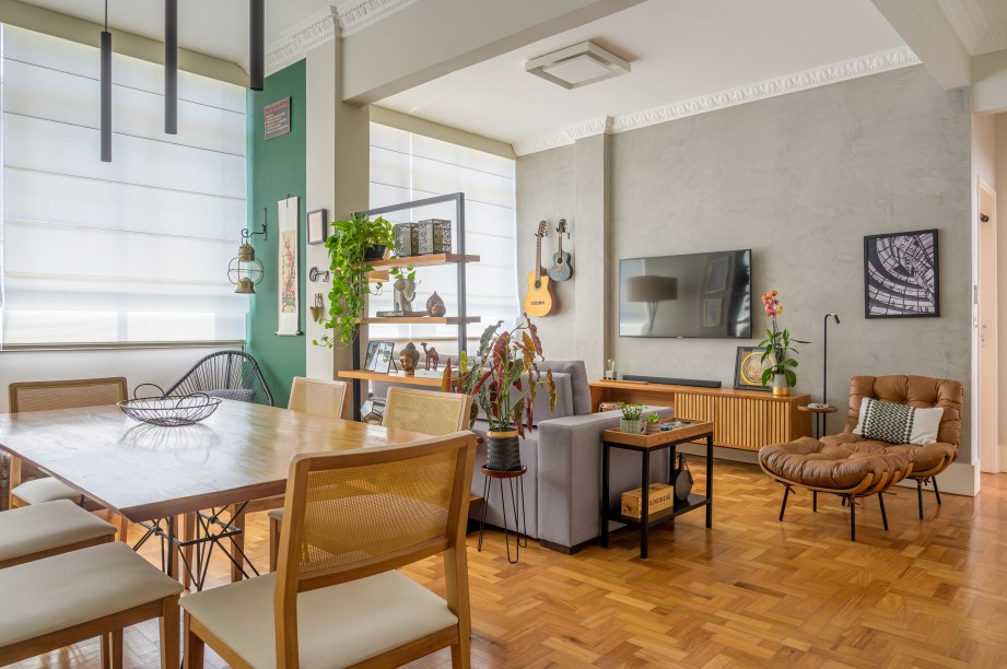 Dentre as estruturas mantidas estão o piso de taco, o pé-direito alto e as sancas decorativas. Boa parte das paredes que dividiam os espaços, contudo, foram postas abaixo. “A primeira coisa foi derrubar o máximo de paredes para integrar os ambientes. A sala cresceu bastante, integrando o primeiro quarto e eliminando o corredor.”