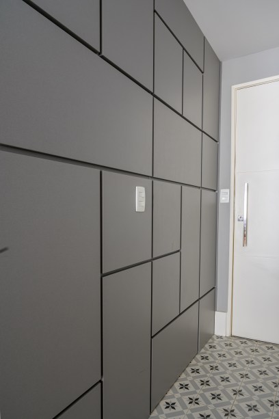 “A área de serviço fica escondida por trás do painel de entrada, que chamamos de ‘passagem secreta'”, revela Paula.