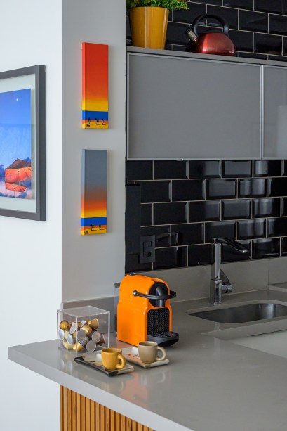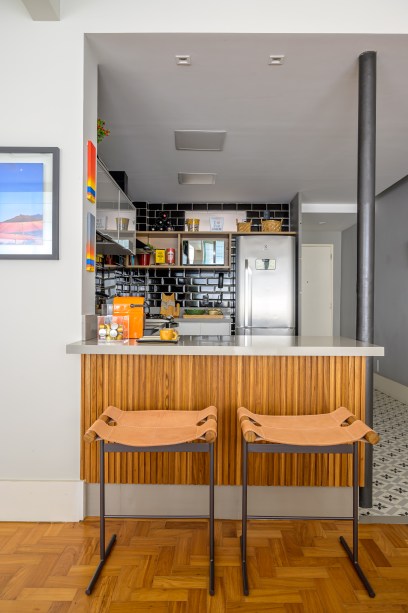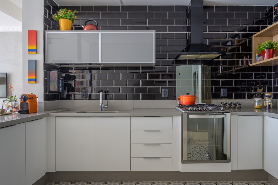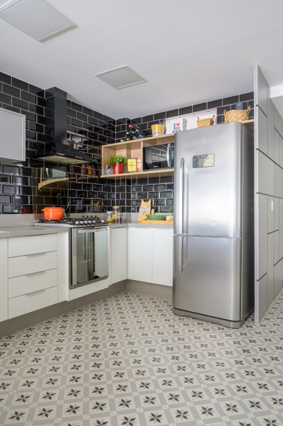 Antes da reforma, a cozinha era apertada e escura. Durante o processo de integração e derrubada das paredes, descobriu-se a tubulação de águas pluviais do prédio. Como ela não podia sofrer alterações, a solução foi deixá-la à mostra, pintada de preto. O piso recebeu um padrão estampado e as paredes o tijolinho preto.