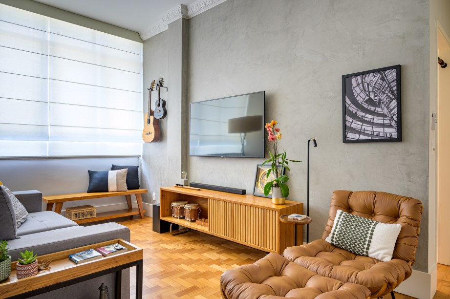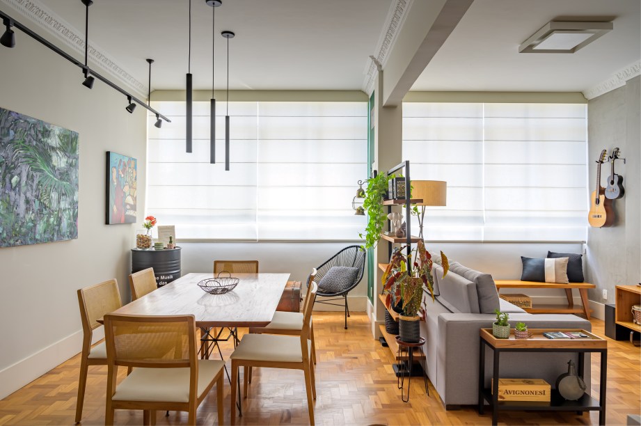 Dentre as estruturas mantidas estão o piso de taco, o pé-direito alto e as sancas decorativas. Boa parte das paredes que dividiam os espaços, contudo, foram postas abaixo. “A primeira coisa foi derrubar o máximo de paredes para integrar os ambientes. A sala cresceu bastante, integrando o primeiro quarto e eliminando o corredor.”
