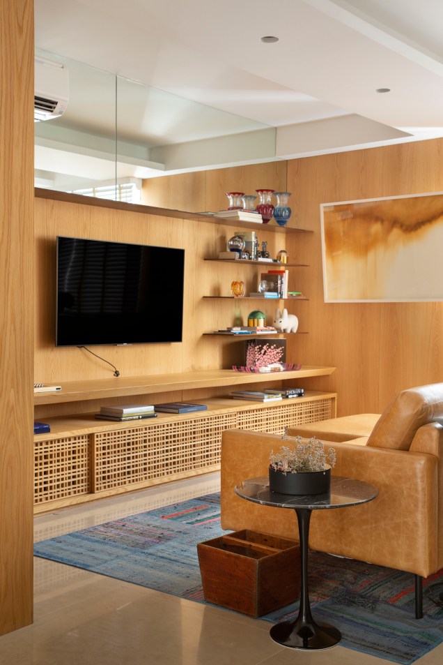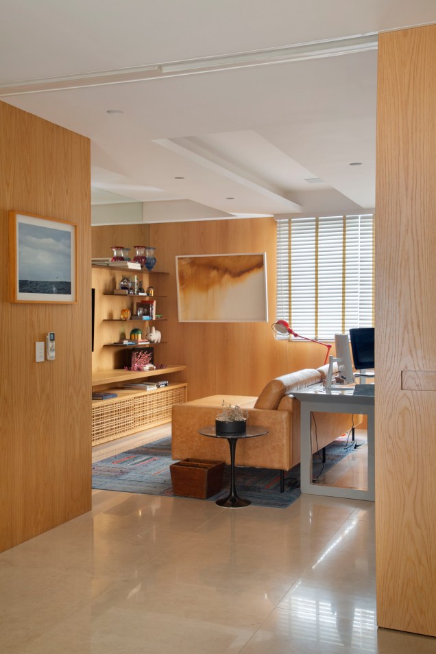 Para deixar o ambiente mais acolhedor e aconchegante, as arquitetas revestiram todas as paredes em peroba e optaram por um sofá estofado em couro marrom. As portas de correr, também executadas em peroba, permitem integrar ou isolar o espaço.
