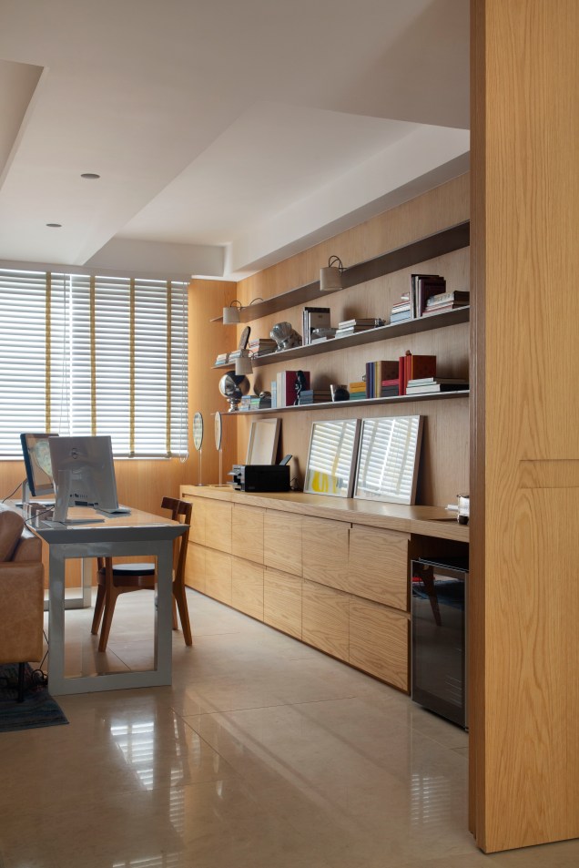 A integração também está presente na sala de TV que também serve como home office. Esse foi um pedido especial dos proprietários, que queriam um espaço para trabalhar e ver televisão com privacidade.