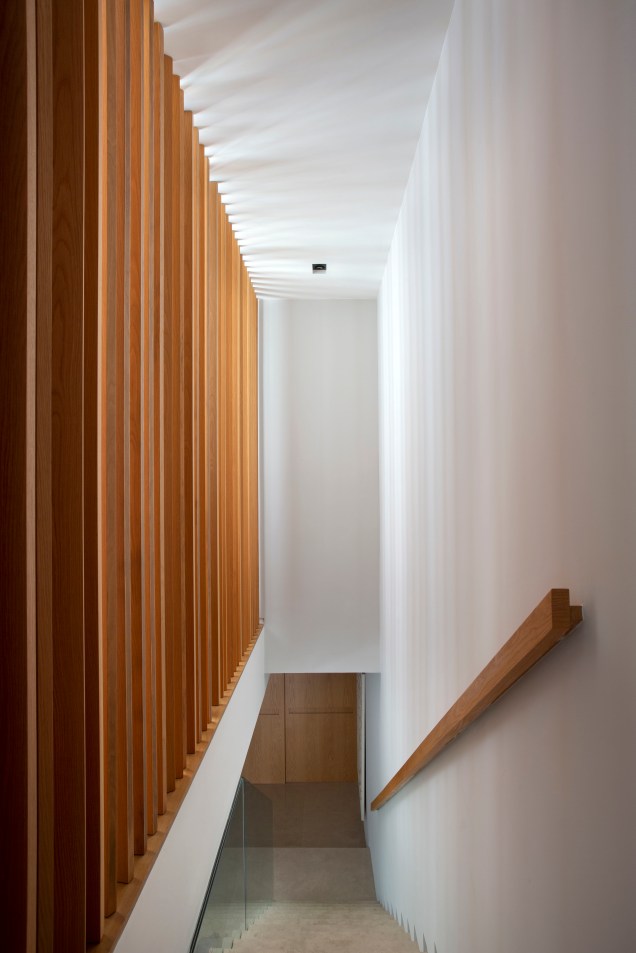 O mesmo limestone foi utilizado para revestir a escada de desenho leve, que recebeu um guarda-corpo em vidro transparente. No segundo piso, brises articulados em peroba oferecem segurança à circulação.