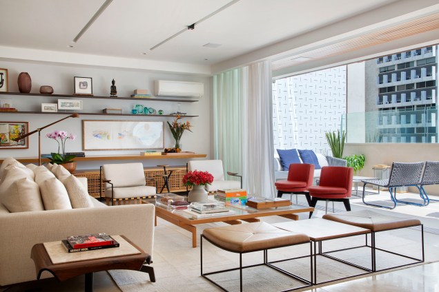 Houve uma grande preocupação em integrar a varanda ao estar. Para isso, Roberta e Paula utilizaram o mesmo piso em limestone, além de grandes portas de correr em vidro que se abrem totalmente. Além disso, uma parede lateral do terraço foi revestida com um grande painel de azulejos, da Lurca.