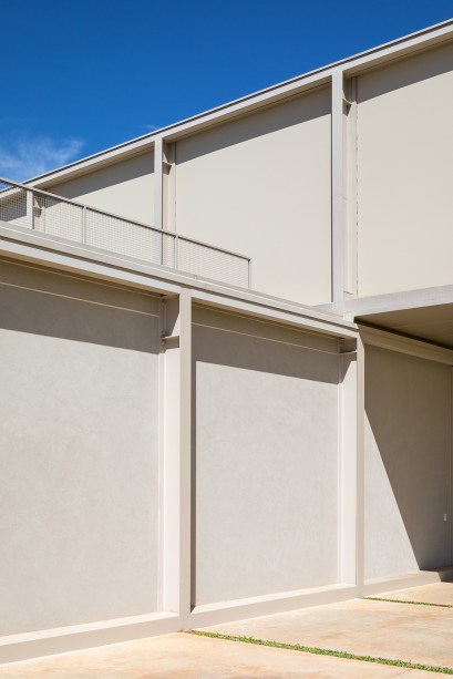 Os trechos em balanço criam áreas cobertas no térreo neste projeto assinado por Bloco Arquitetos pensado para ficar pronto no menor tempo possível