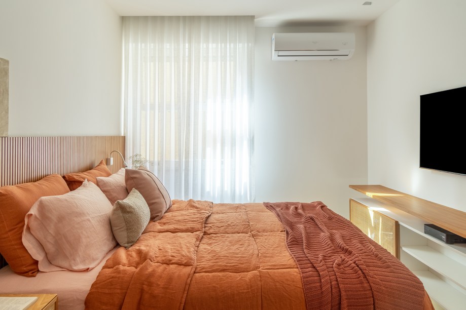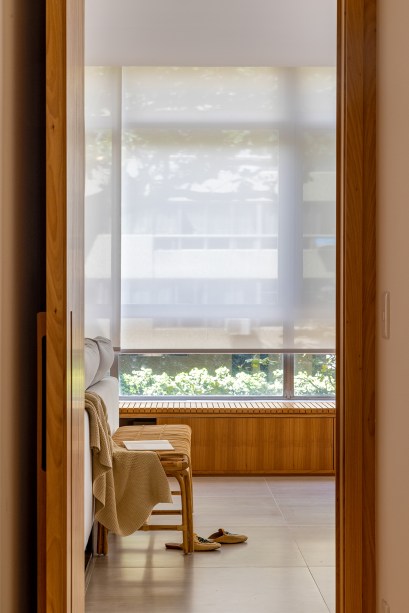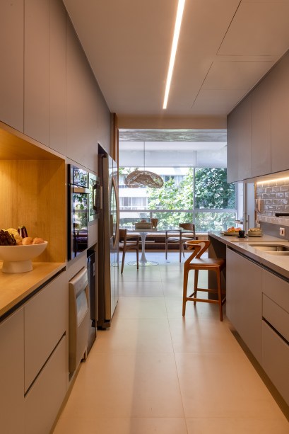 “Emolduramos a vista das árvores do apartamento com um banco de peroba do campo que abraça toda a sala e valorizamos a iluminação natural no principal cômodo do imóvel”, conta Manu que, a pedido dos clientes, optou por uma iluminação mais indireta e aconchegante com sancas e arandelas.