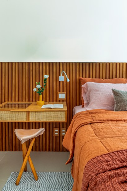 “O uso do painel combinado a outros elementos naturais como a palha e o mármore trazem o aconchego que o casal tanto desejava para seu novo lar, criando um ambiente leve e acolhedor”, conta a arquiteta.