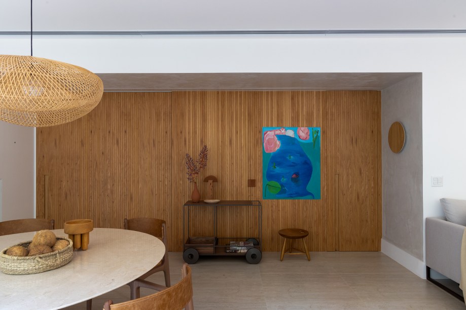 Para tornar os ambientes integrados e criar uma circulação mais fluida, as paredes do hall e da cozinha foram derrubadas. Em seu lugar, surgiu um grande painel ripado feito de peroba do campo que tanto pode esconder como revelar a cozinha e a passagem para a área íntima.