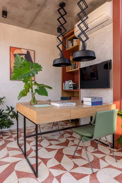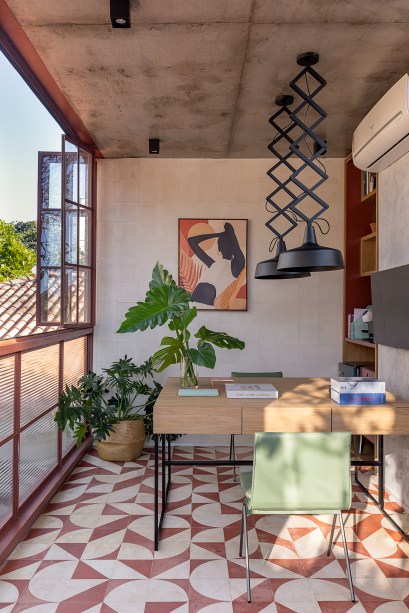 Para o home office, o desafio era criar um ambiente totalmente novo em cima da laje da área de churrasqueira existente. O local era supostamente um solarium nunca usado, porém dispunha de dois pontos de partida: um piso maravilhoso de ladrilho hidráulico e uma parede verde que estava abandonada.