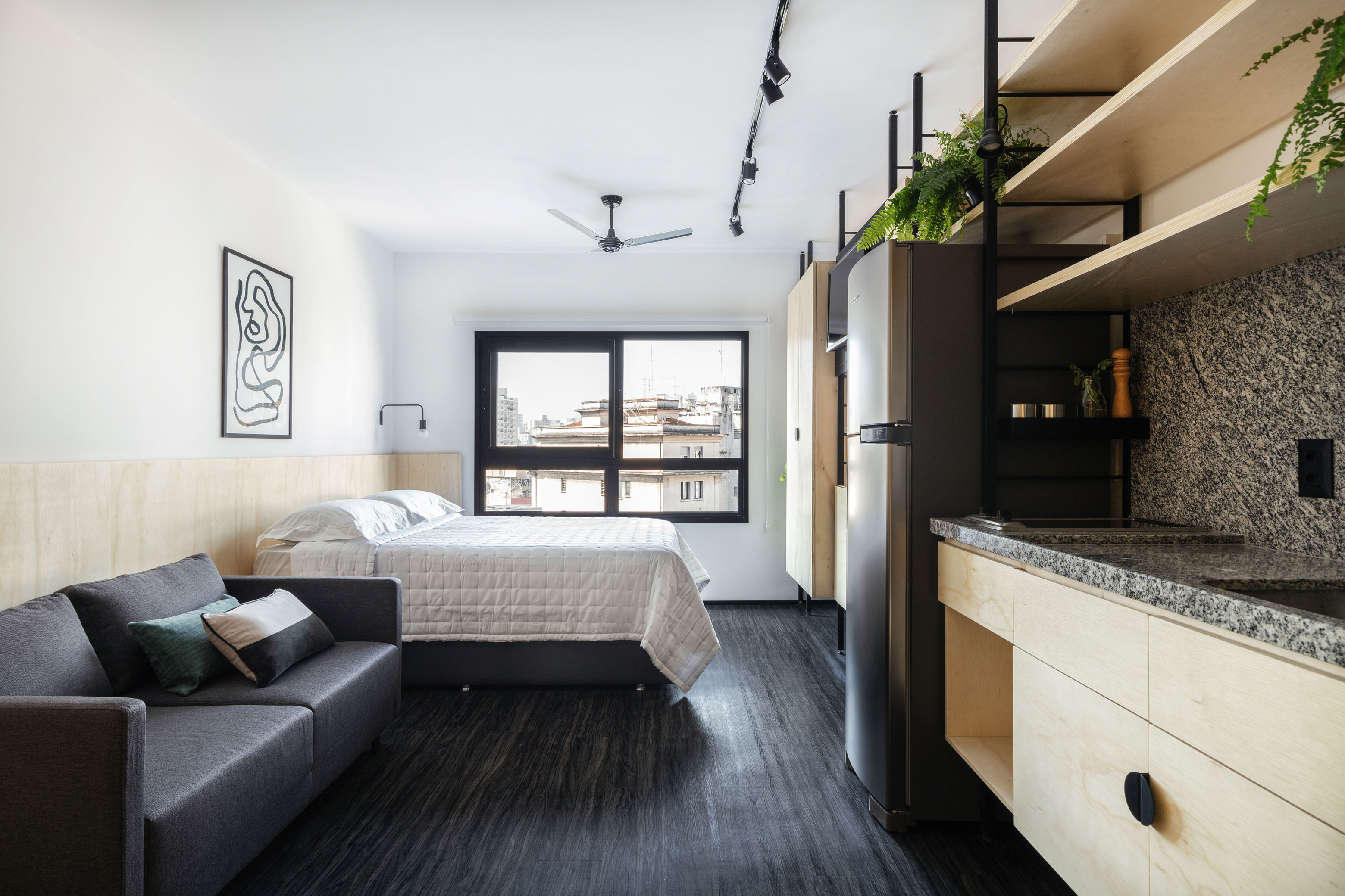 Com projeto de interiores assinado pelo escritório Macro Arquitetos, este estúdio de 29 m² localizado na Consolação, em São Paulo, teve como proposta integrar os ambientes e criar móveis de forma prática e compacta.
