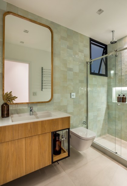 Outro destaque do projeto é o banheiro da suíte master, que foi dividido em dois ambientes: de um lado fica a bancada e do outro um espaço reservado para banhos relaxantes, com direito à banheira de imersão de sobrepor no piso e ducha no teto. “A ideia aqui foi criar um clima de spa no banheiro do casal”, explica Rafael.