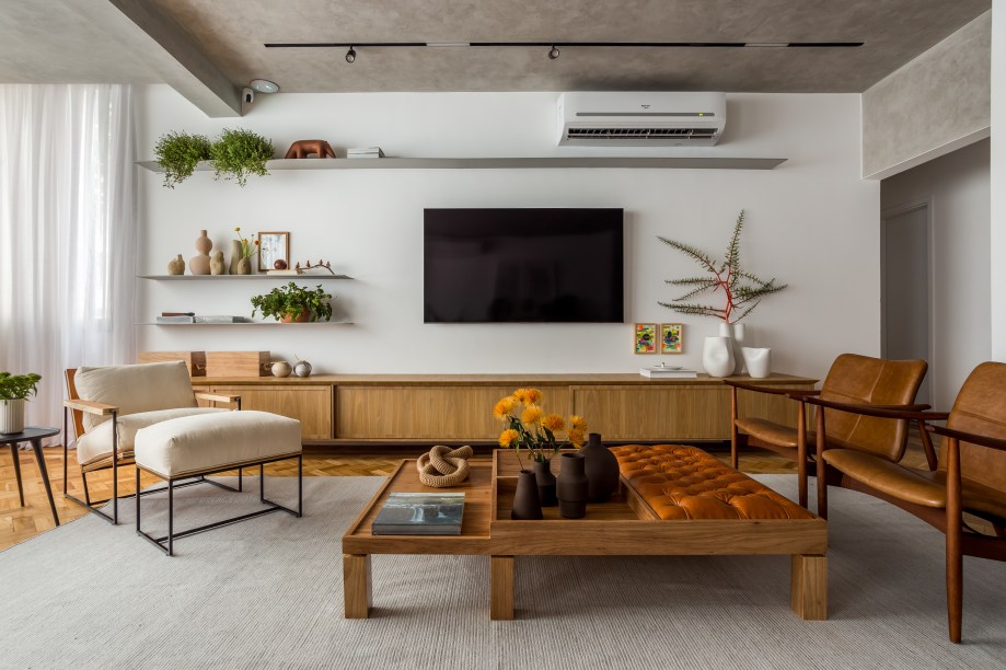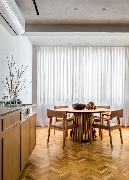 “Os clientes me deram total liberdade para propor soluções de arquitetura de interiores e decoração, incluindo demolições de paredes para integrar ou ampliar os espaços”, conta o arquiteto. “A intervenção foi radical. Somente o piso original em taco foi restaurado e protegido com sinteco fosco”, acrescenta ele.