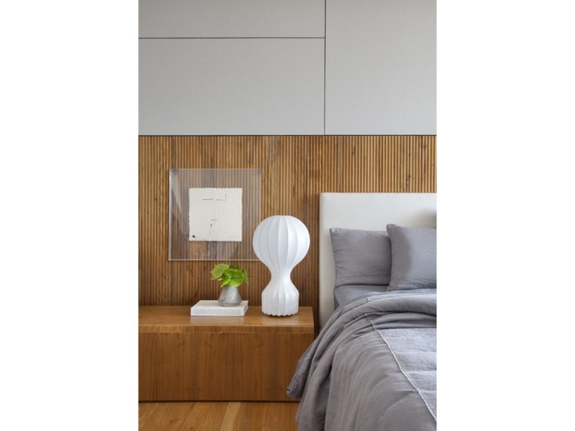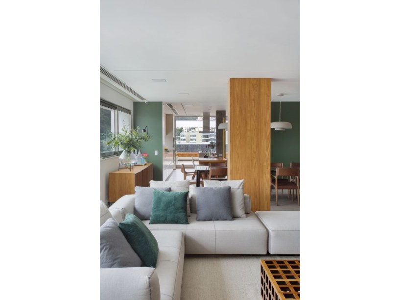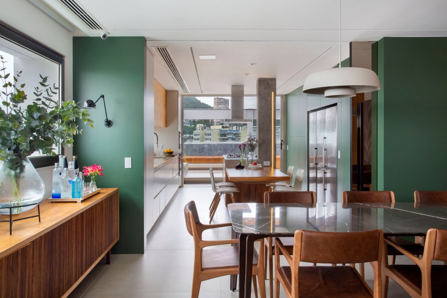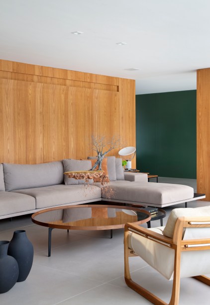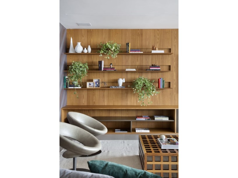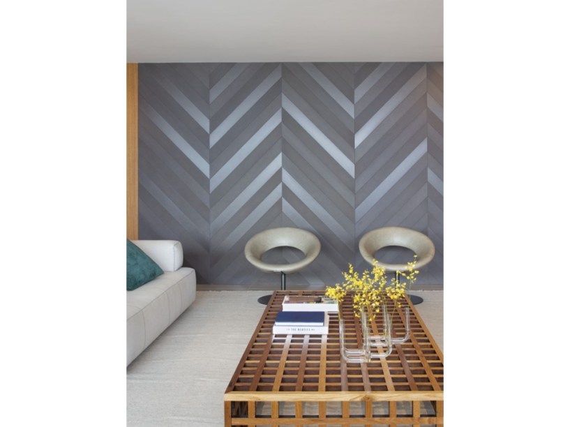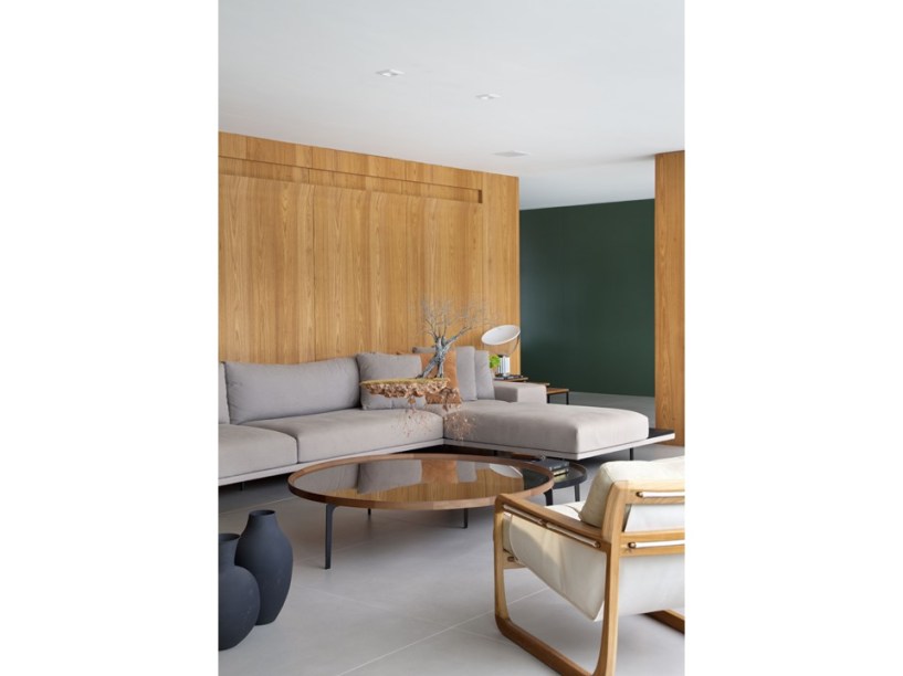 Na sala de tv, rouba a cena o painel de MDF pigmentado de cinza escuro, desenhado pelo escritório, com ripas trabalhadas em três texturas (natural, acetinado e áspero), paginadas aleatoriamente em chevron. Já a área de jantar com cozinha integrada, que forma um volume entre o estar e o terraço, ganhou painéis em marcenaria num tom verde, trazendo vida e cor ao conjunto.