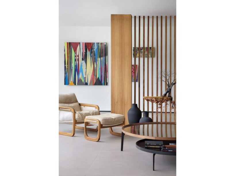 Na sala de TV, o destaque fica por conta do sofá Lençóis Maranhenses (com assento em blocos, encostos removíveis e módulo lateral que também pode ser usado como chaise), as duas poltronas Anel 80’s, de Ricardo Fasanello, e a mesa de centro Cubo Libre, de Claudia Moreira Salles.