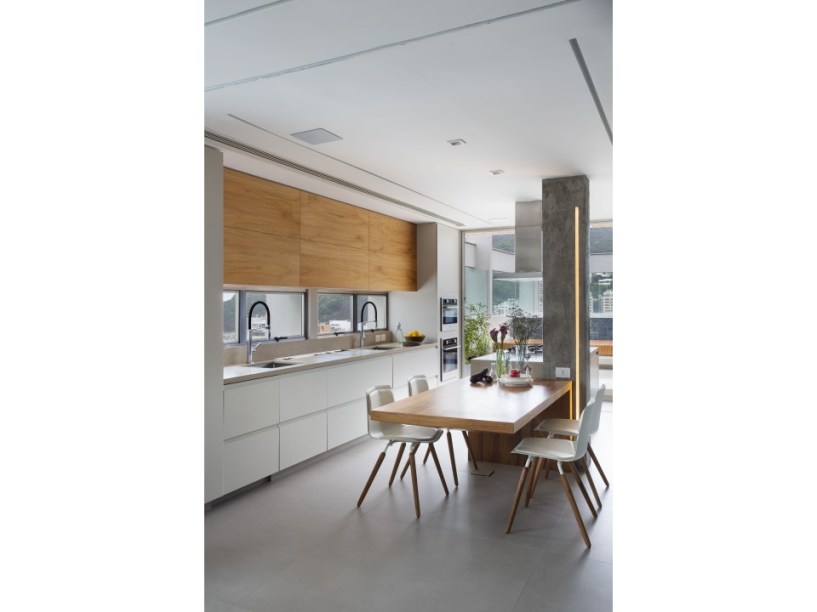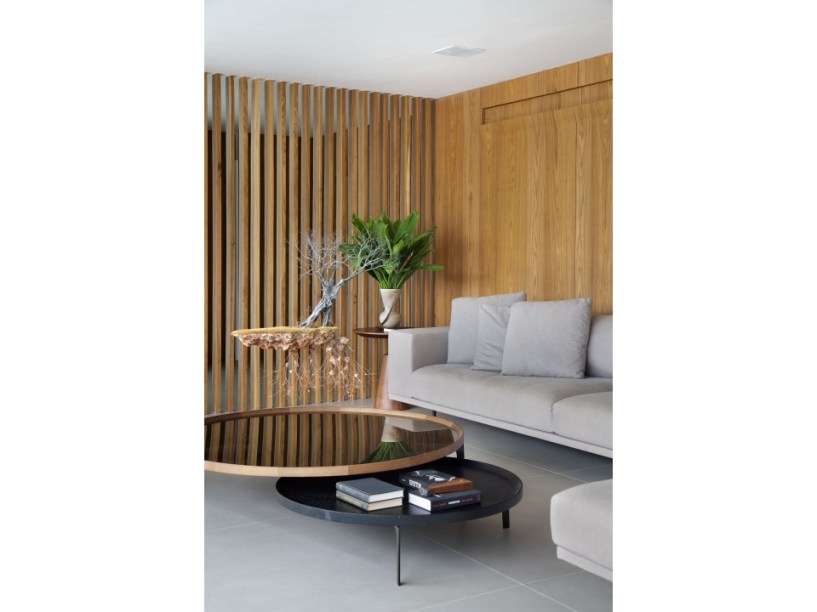 Para criar uma unidade visual neutra contínua em toda a área social, tanto interna como externa, foi escolhido o mesmo piso de porcelanato em formato grande, num tom de cinza claro, para todo o espaço. Com a intenção de acrescentar conforto visual e tátil, a marcenaria foi revestida com lâminas de freijó natural, incluindo os pilares, que foram revestidos no mesmo material.