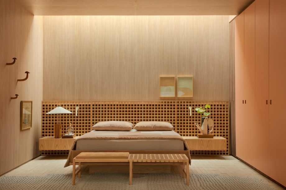 No quarto, o armário embutido é apresentado em uma releitura do mobiliário lançado pela Celmar nos anos 1950. Já a cama e sua cabeceira, o banco e a mesa lateral são assinados pela Très Arquitetura para a Casapronta.