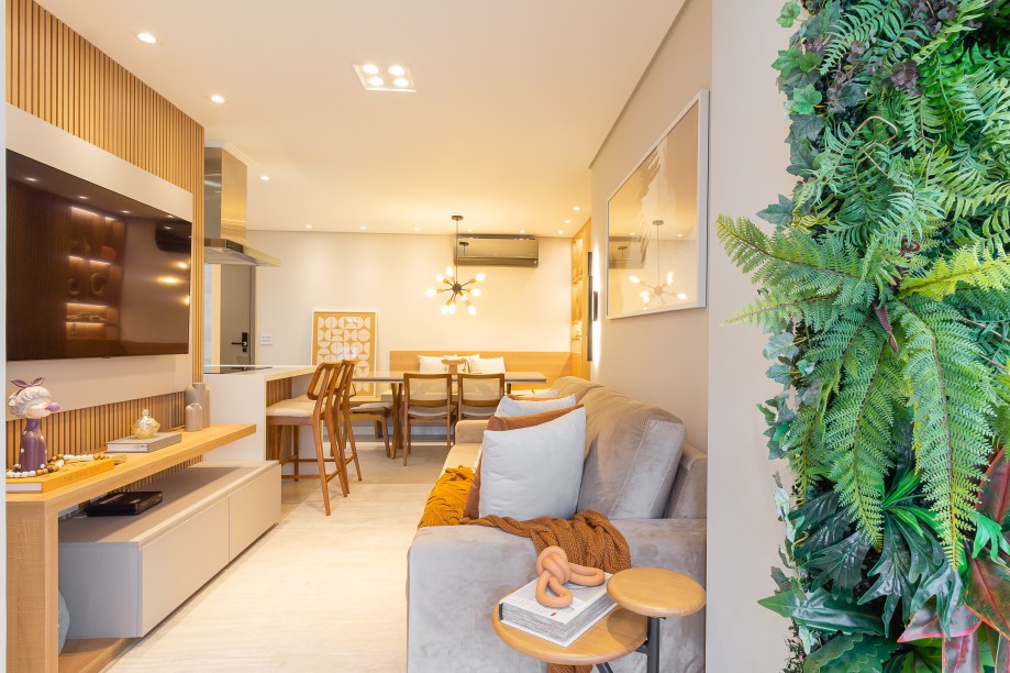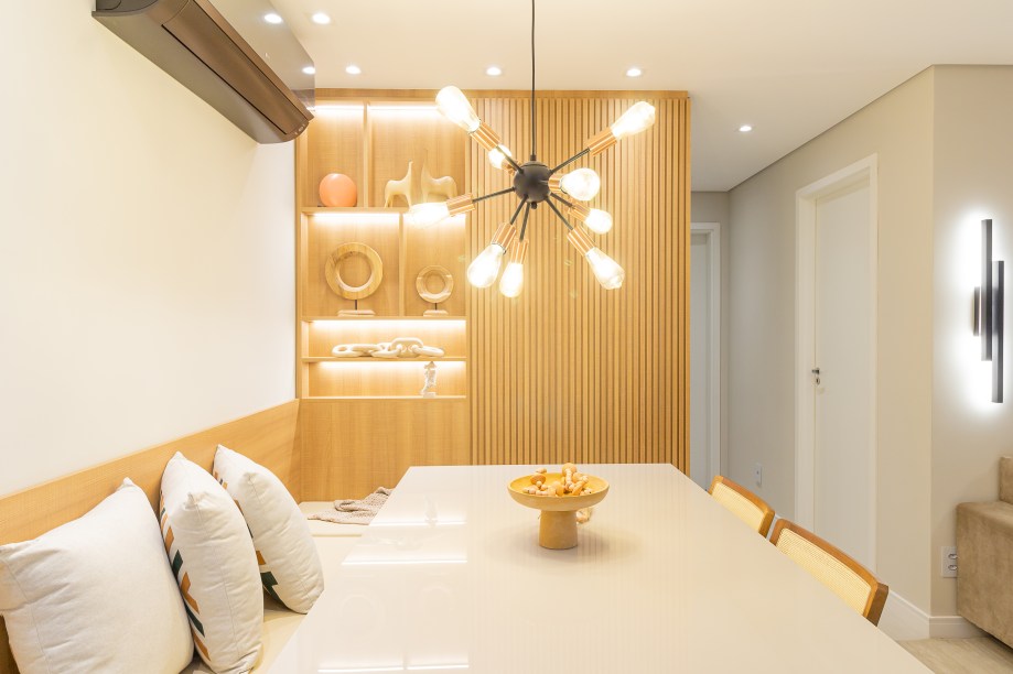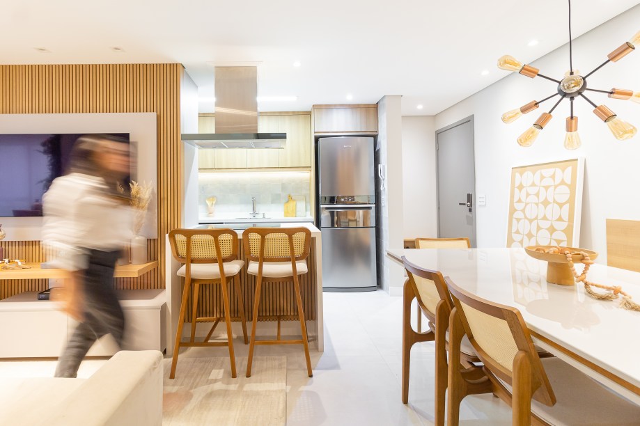 Na sala de estar, o painel ripado é o protagonista, abrigando a TV. Ripas de madeira também estão presentes na sala de jantar, na parede que emoldura o canto alemão. A mesa de jantar em tom off white dialoga com a bancada da cozinha e as cadeiras de palinha com as banquetas.