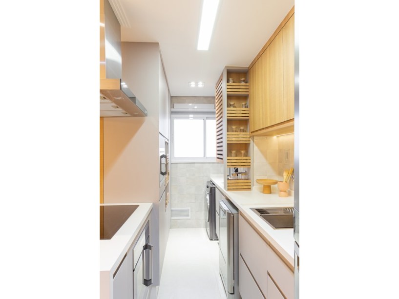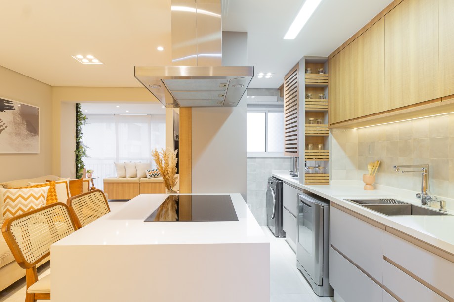 “Ampliamos a cozinha para que coubesse nela um armário alto com torre quente. Os nichos vazados com ripas deixam o ambiente bem leve”, conta a arquiteta. Integrada com o restante da área social, a cozinha conta com uma ilha com pia e bancada de quartzo branco e duas banquetas de apoio.
