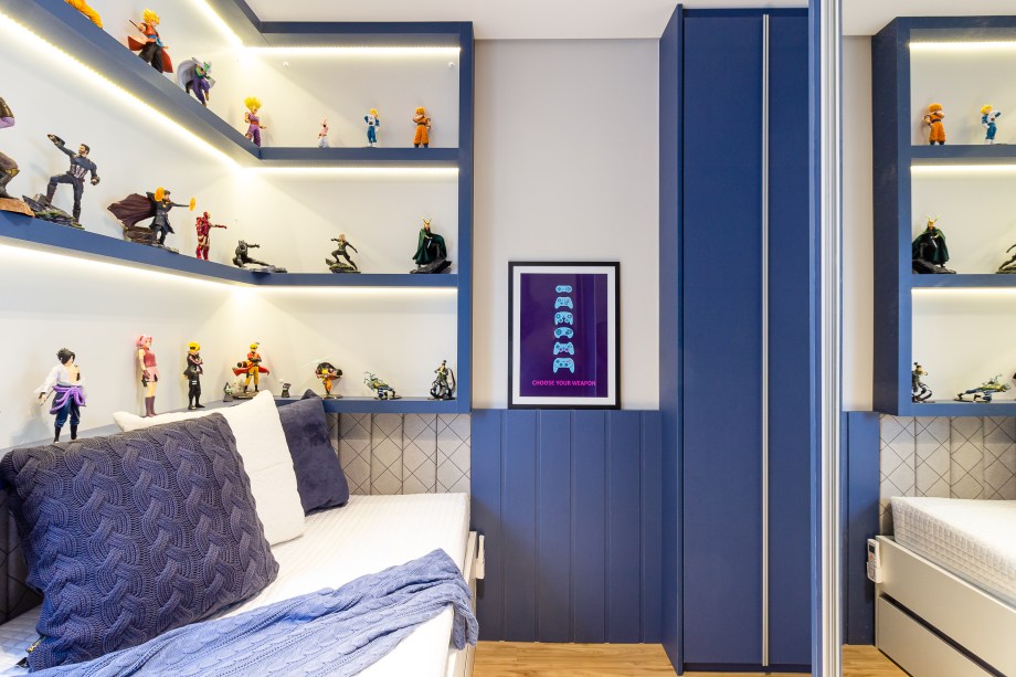 A parte íntima traz a suíte do casal com um closet oculto na marcenaria e um quarto infantil estiloso, com paredes de lambri azul e nichos para abrigar a coleção de bonecos do pequeno ocupante. Além, é claro, de um canto gamer, com direito a cadeira gamer!