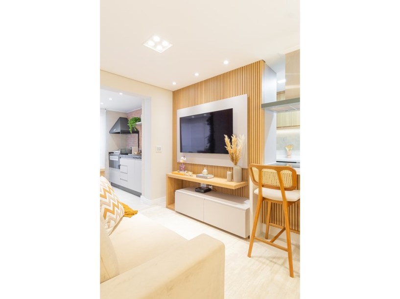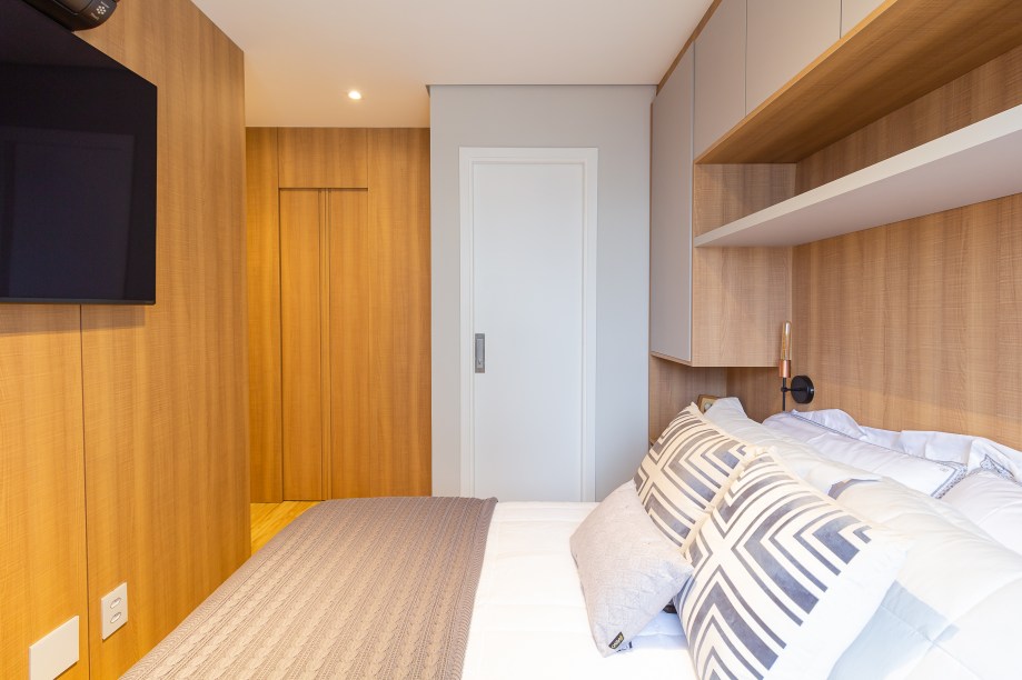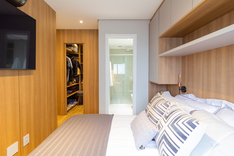 A arquiteta Paloma Sousa criou um projeto clean e minimalista, que conta com varanda gourmet e closet oculto na marcenaria do quarto