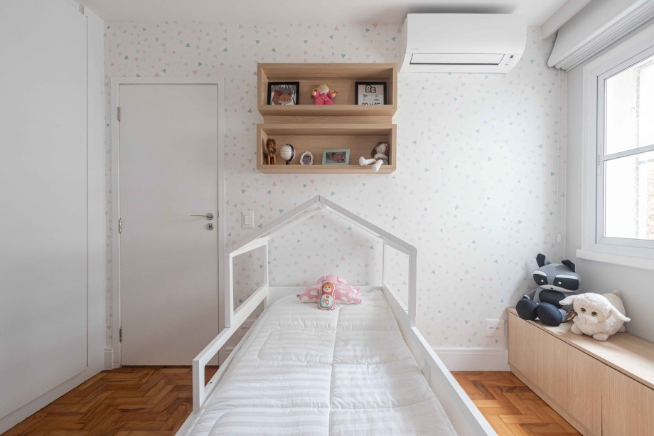 As quebras com detalhes rústicos aconteceram com a parede de tijolos na sala de estar e no tom mais quente do painel de madeira. Nas áreas íntimas, o taco de madeira existente foi reaproveitado e restaurado, proporcionando mais aconchego aos quartos.