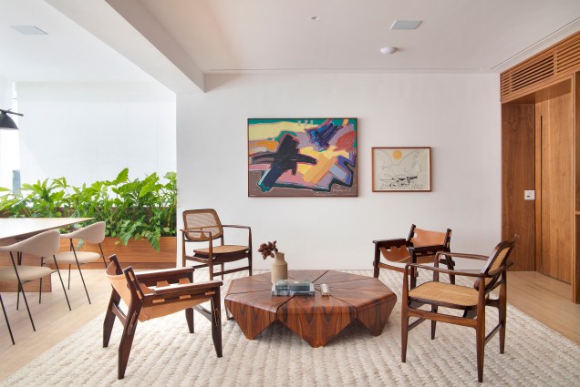 Entre as peças de acervo dos clientes que foram aproveitadas na área social, os arquitetos destacam os móveis de Sergio Rodrigues (como a poltrona Mole, a mesa de centro Arimello, o banco Mucki e as poltronas Oscar e Kilin) e alguns quadros de artistas consagrados, como Luiz Aquila, Picasso e Burle Marx.