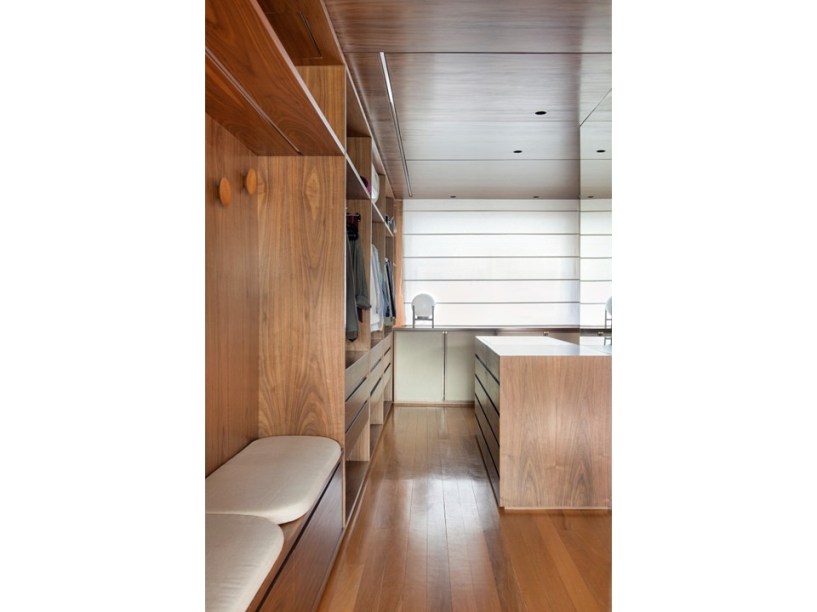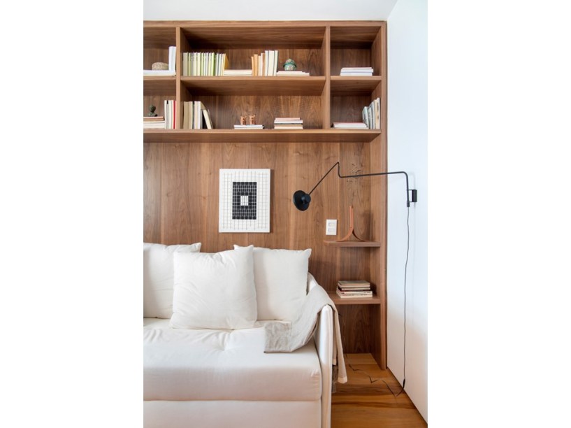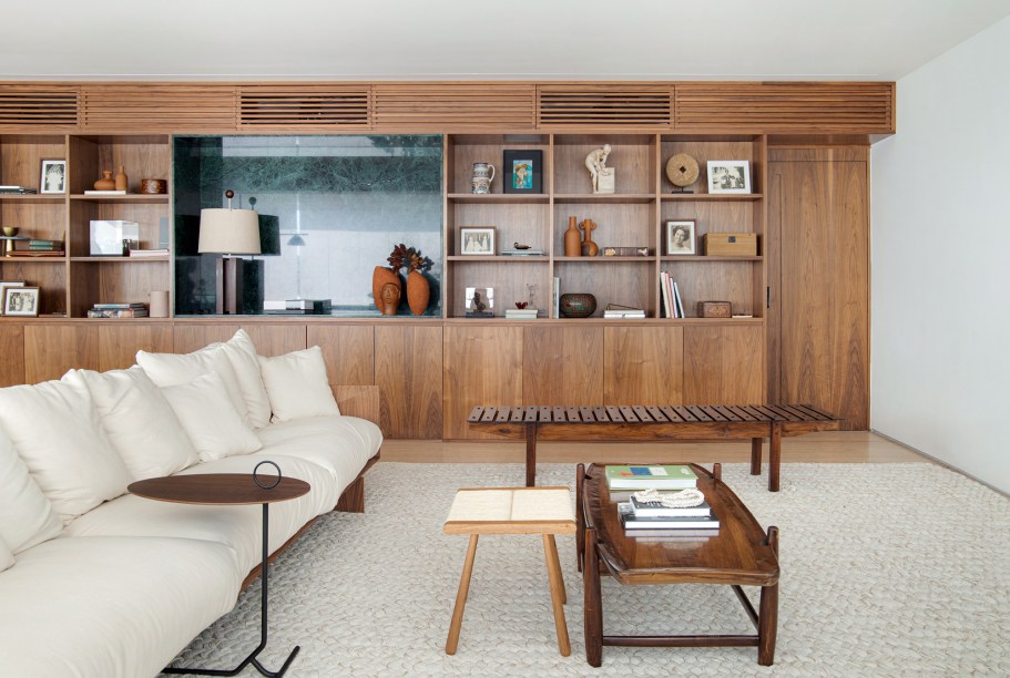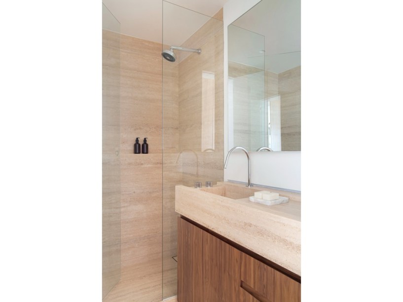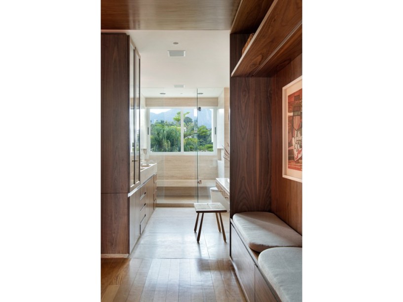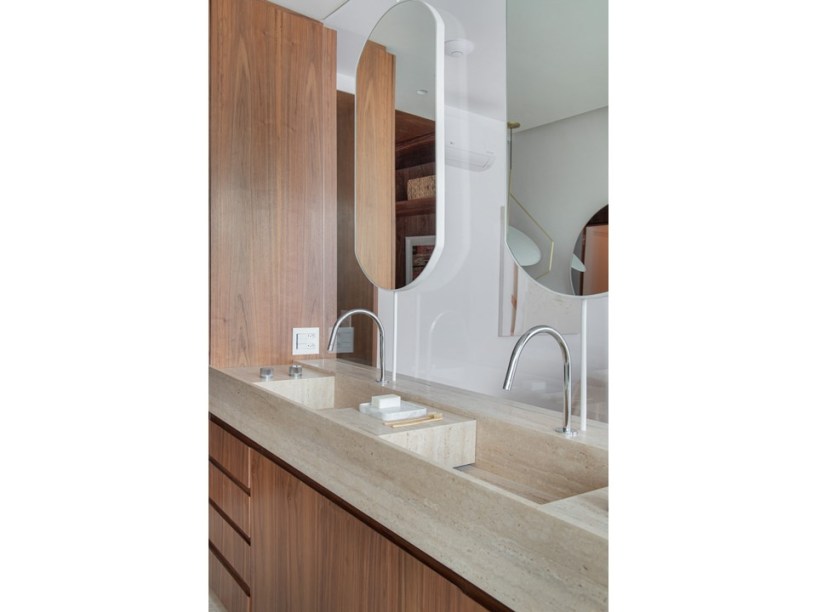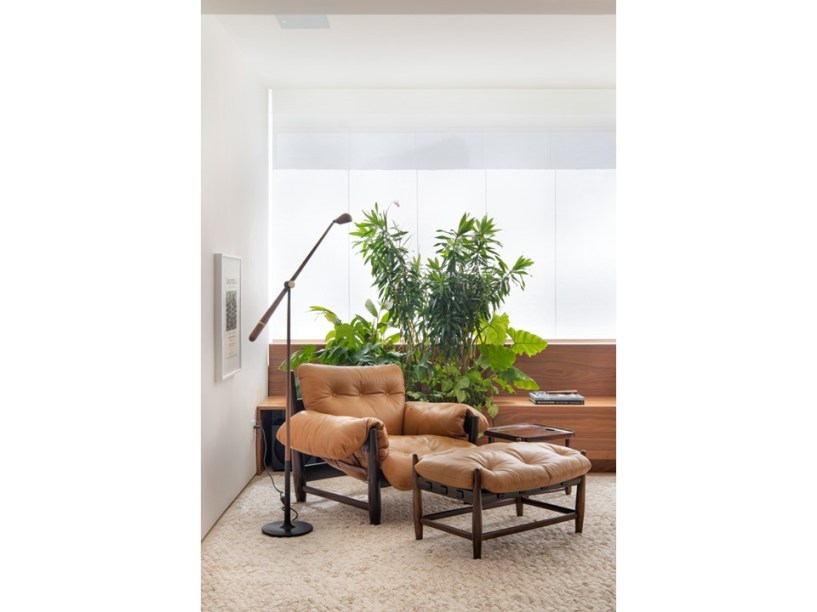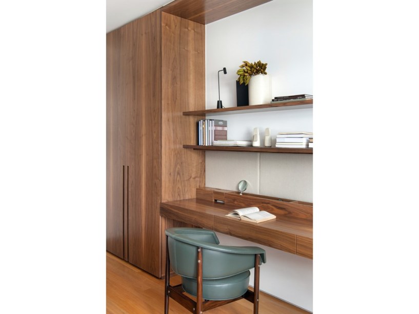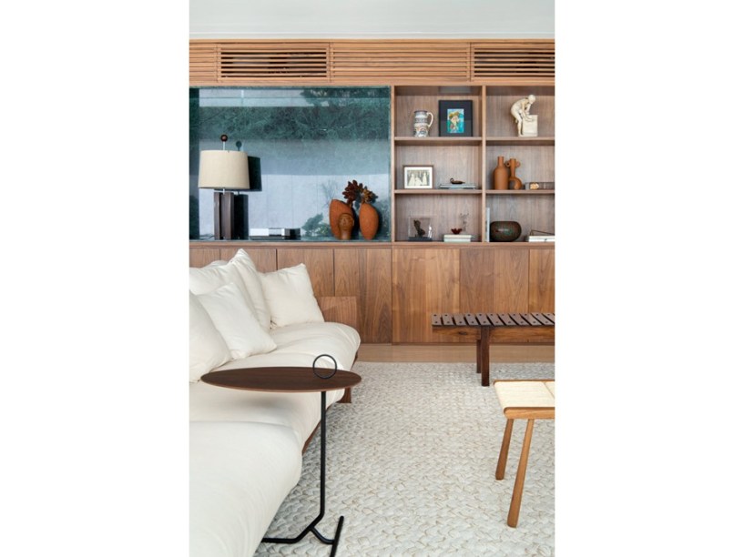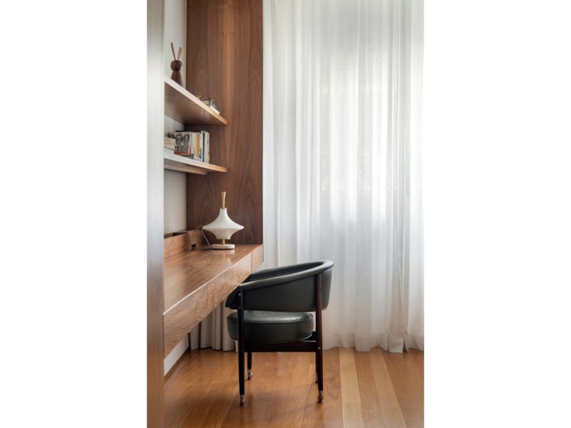 “Eles são grandes admiradores do design brasileiro e já possuíam muitas peças originais arrematadas em leilão”, revela Pedro. Em se tratando de materiais de acabamento, foram usados apenas três tipos em todo o projeto: mármore travertino no piso, madeira nogueira na marcenaria (num tom semelhante às peças do acervo) e paredes brancas.