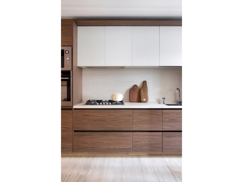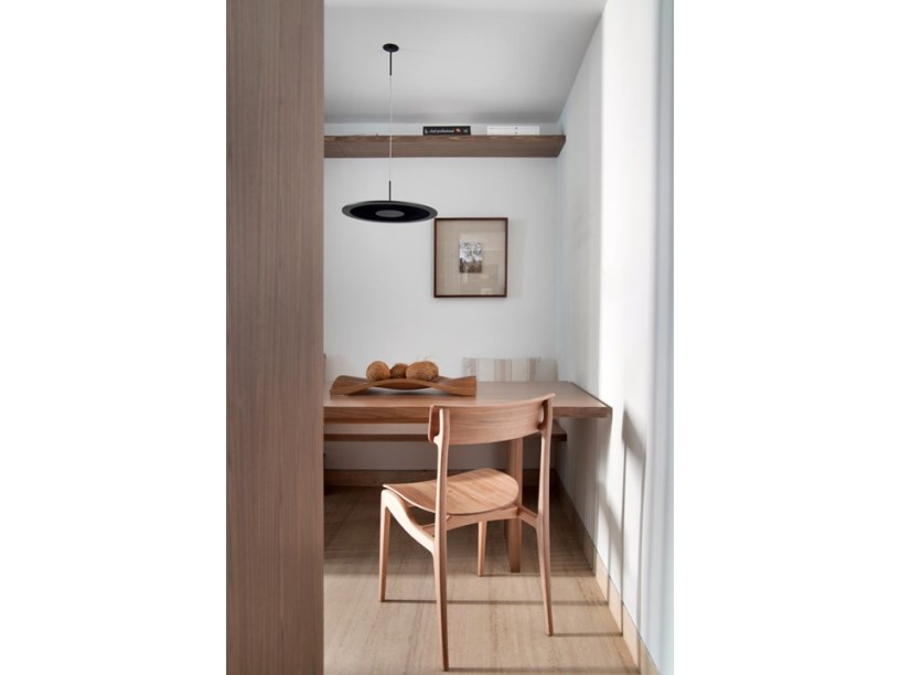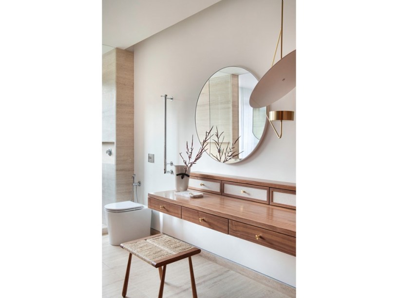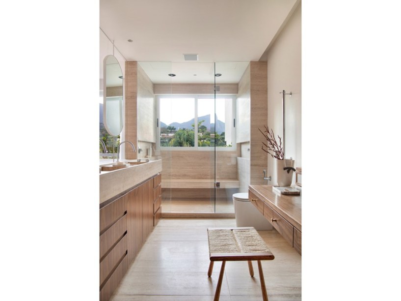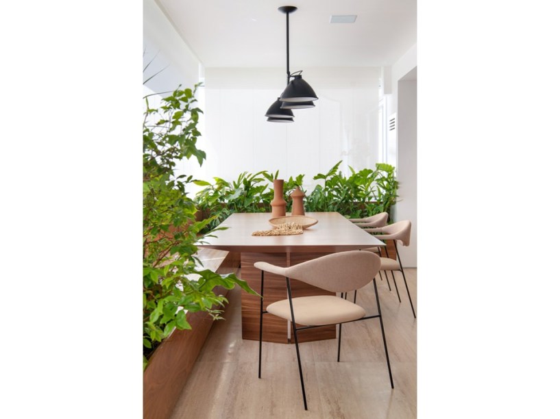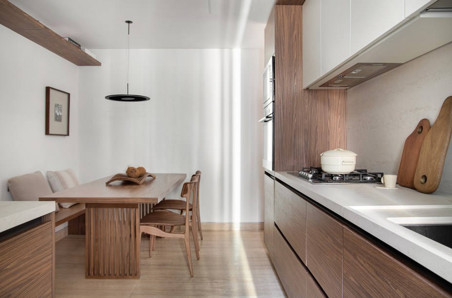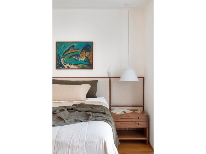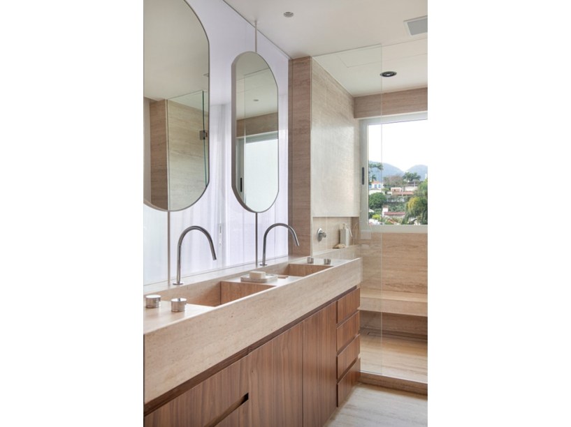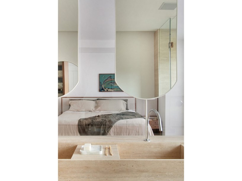 “Eles são grandes admiradores do design brasileiro e já possuíam muitas peças originais arrematadas em leilão”, revela Pedro. Em se tratando de materiais de acabamento, foram usados apenas três tipos em todo o projeto: mármore travertino no piso, madeira nogueira na marcenaria (num tom semelhante às peças do acervo) e paredes brancas.