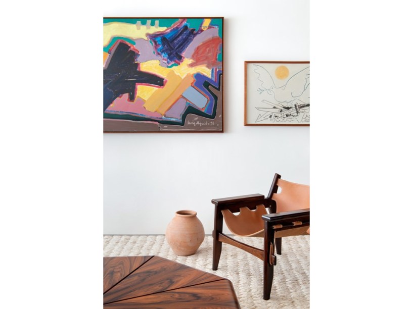 Entre as peças de acervo dos clientes que foram aproveitadas na área social, os arquitetos destacam os móveis de Sergio Rodrigues (como a poltrona Mole, a mesa de centro Arimello, o banco Mucki e as poltronas Oscar e Kilin) e alguns quadros de artistas consagrados, como Luiz Aquila, Picasso e Burle Marx.