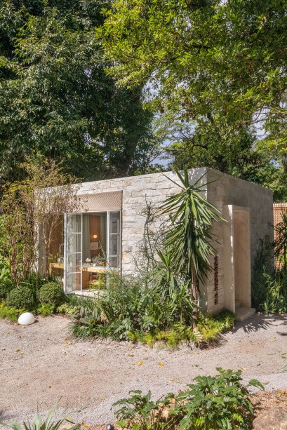 Materiais naturais e pedras brasileiras dão charme a bangalô de 29m²
