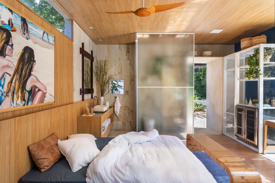 Outro grande trunfo do projeto é a permeabilidade do espaço e, para isso, o vidro foi um grande aliado da arquiteta – repare que o material está presente na divisória entre o dormitório e o banheiro (em versão translúcida), no alto da parede atrás da cama (em forma de “rasgo”), em grandes vãos nas paredes laterais e na porta-camarão em serralheria branca da fachada frontal da construção, que lembra uma caixa de pedra bruta.