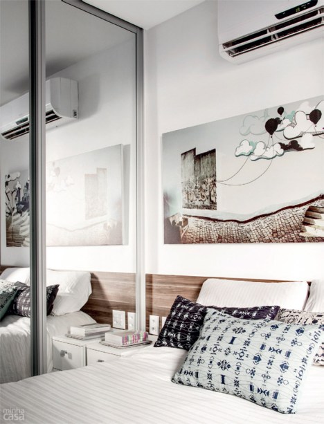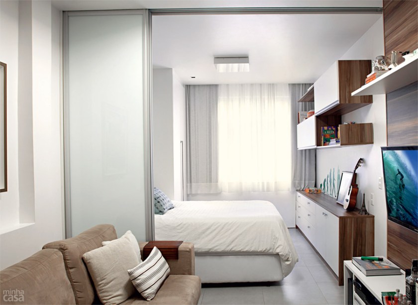 Em apenas 26,55 m², o rapaz carioca conseguiu organizar sua vida, seus pertences e seus hobbies. Menos divisórias e marcenaria planejada lideram a lista de boas ideias