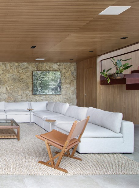 Segundo os arquitetos, no quesito “acabamentos”, foram privilegiados materiais naturais, a exemplo do piso de cimento, o teto da área social com painéis lisos de freijó natural e as paredes, ora com pedra de Aré marrom ora com painéis ripados de freijó.