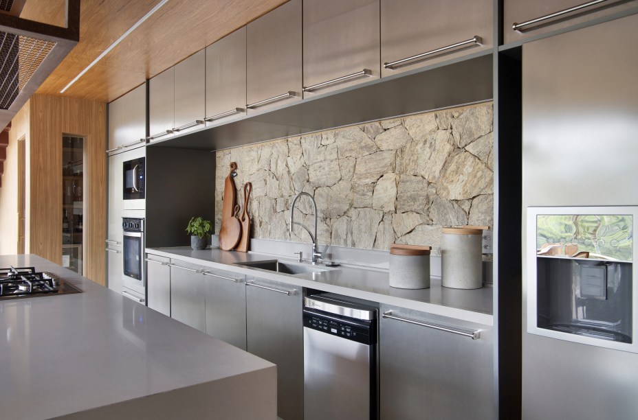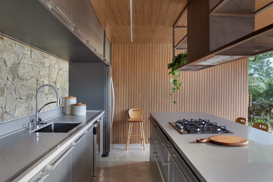 “Esses materiais reforçaram ainda mais a conexão dos espaços internos com a natureza exuberante ao redor”, justifica Raposo. Já a lareira da sala ganhou detalhes em aço cortén, enquanto a cozinha conta com armários de aço inox e bancadas de quartzo cinza.