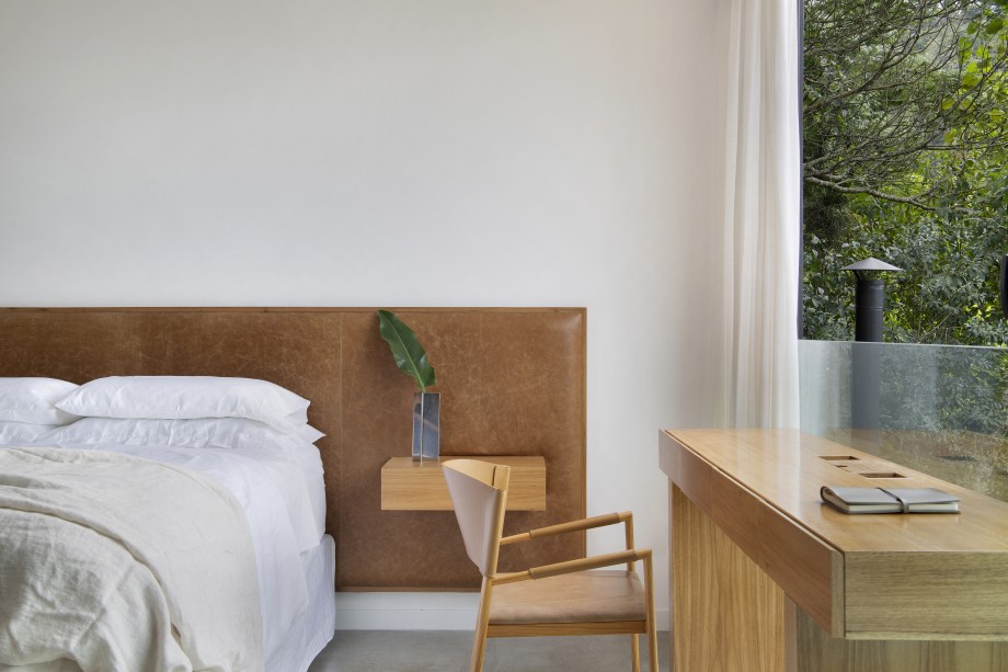 Na suíte do casal, o destaque fica por conta da mesa de trabalho de frente para a vista externa, as esquadrias com isolamento acústico e o box do banheiro com esquadrias de vidro do piso ao teto (com venezianas móveis, para garantir privacidade), também voltadas para a área externa.