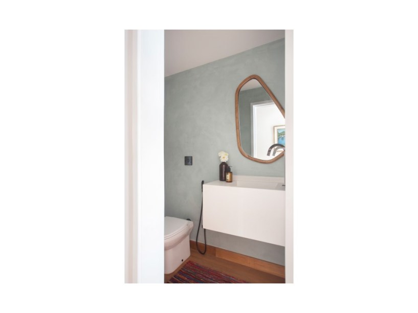 Como todos os espaços da área social são integrados, a dupla desenhou uma grande estante, também em marcenaria, que vai do piso ao teto. O móvel possui a função de louceiro que ajudou a setorizar a sala de jantar e hall de entrada, garantindo mais privacidade aos moradores.