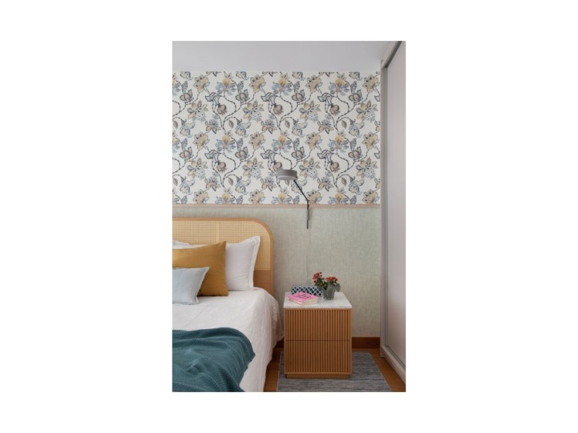 No quarto do casal, a combinação da cabeceira em palhinha natural, a cortina de linho, o piso, os móveis de madeira natural e o mix de papel de parede com estampa floral e textura resultaram no espaço mais acolhedor da casa.